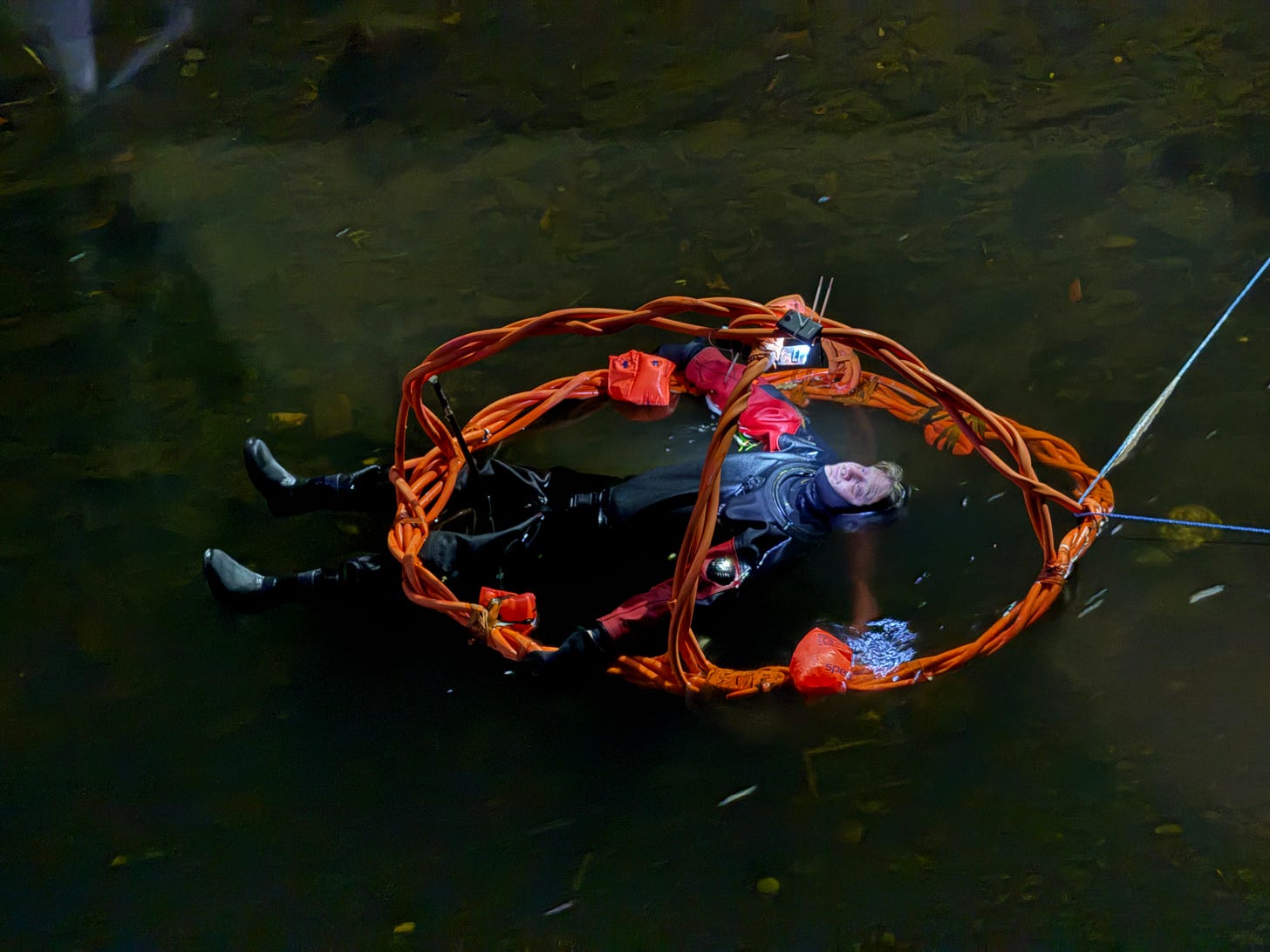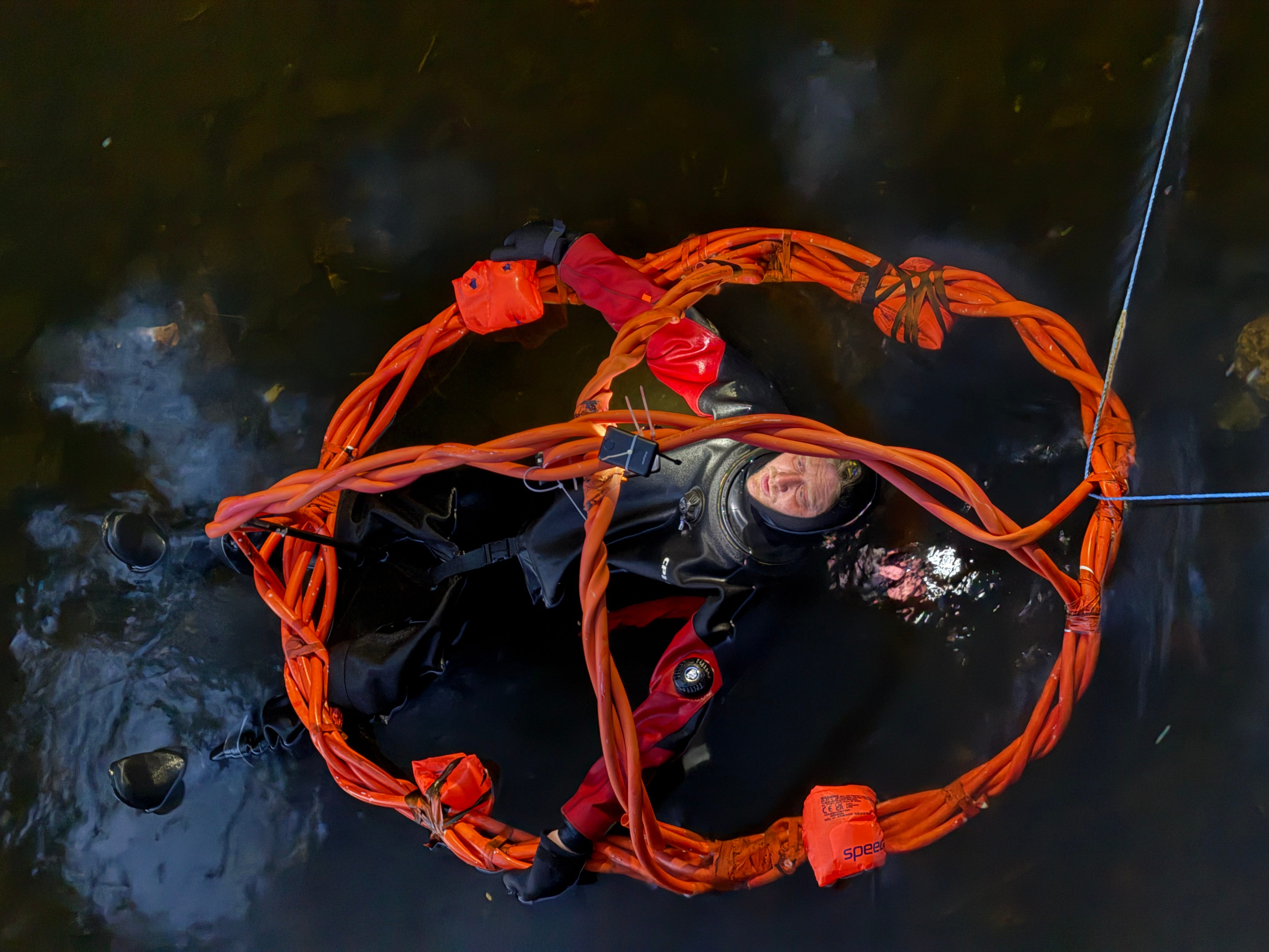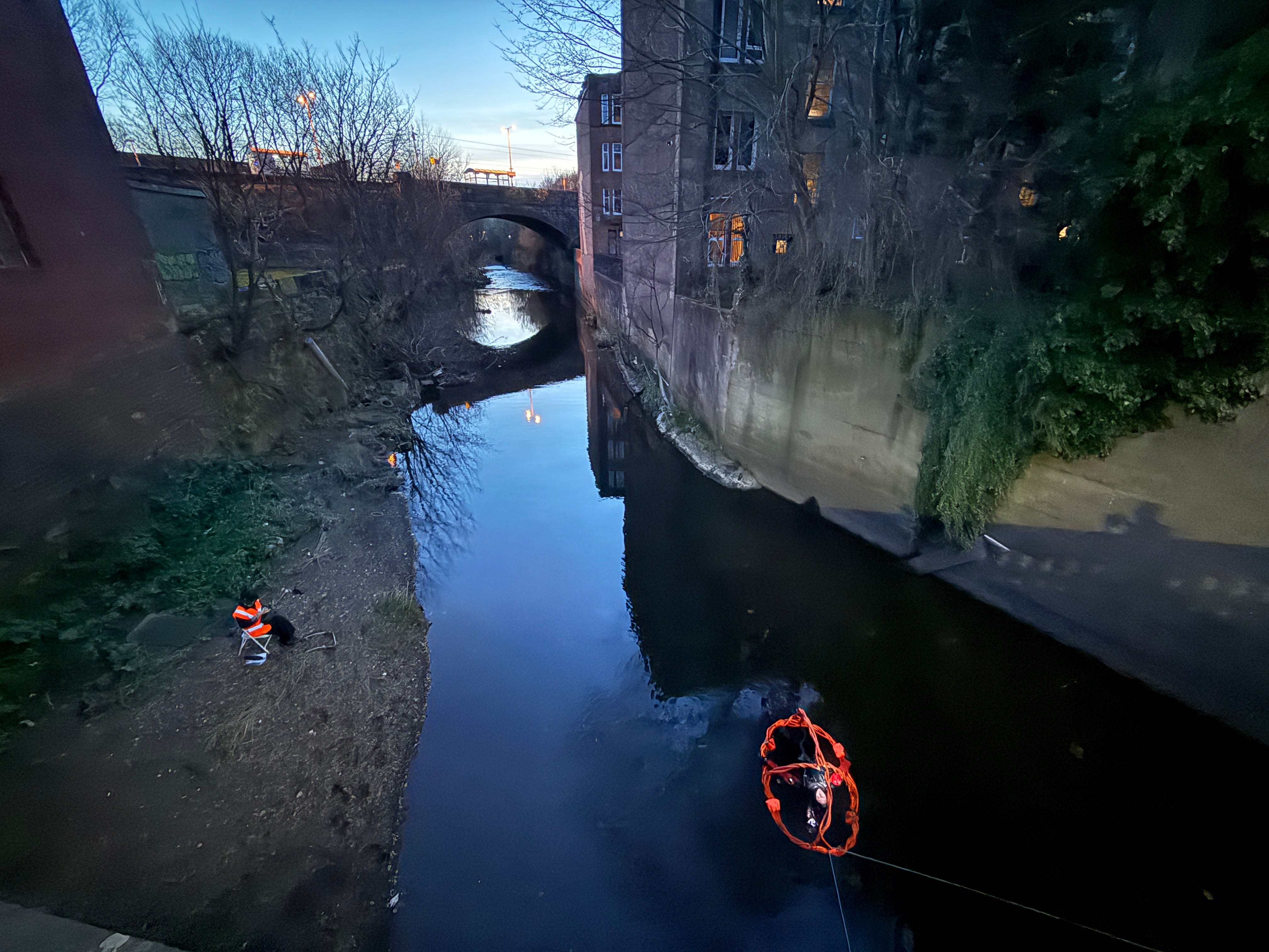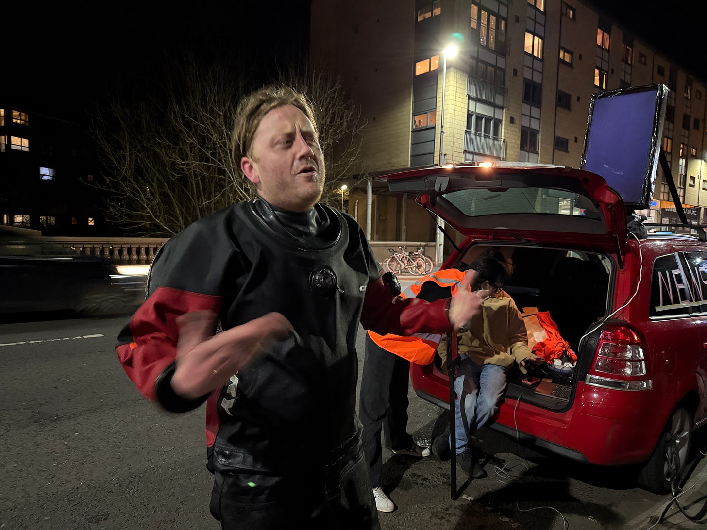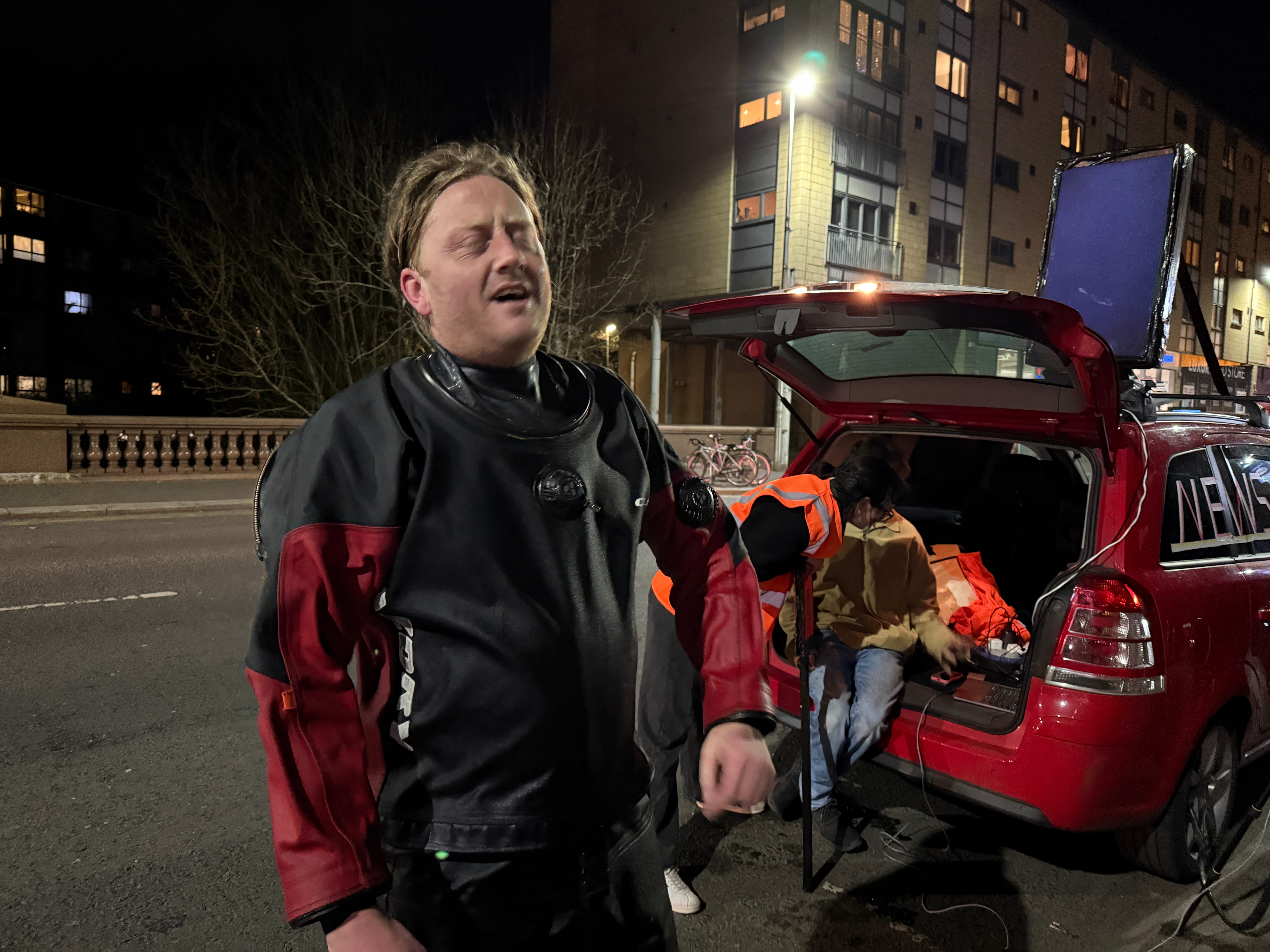 On 25 March 2025, Josh Wirz spent an hour lying in a river. He was wearing a wet suit and was attached to a structure that relayed a video feed while, at the same time, David Hicks (standing in for Berger who was ill) pretended to be a news journalist reporting on the event from the bridge above.